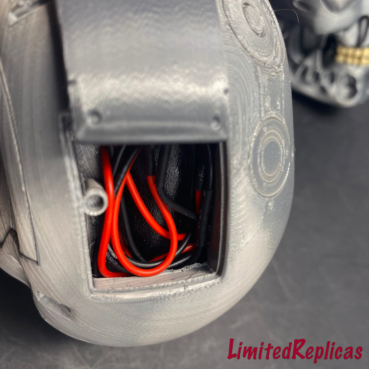 This is the halfsize version of a custom made fan art piece where each one is unique. This piece features a dark color metallic layered finish with electronic projection style red eyes. The eyes are bright projection style lights where LEDs shine through an iris and a glass lens. The projection style eyes are similar to what is found in T1.